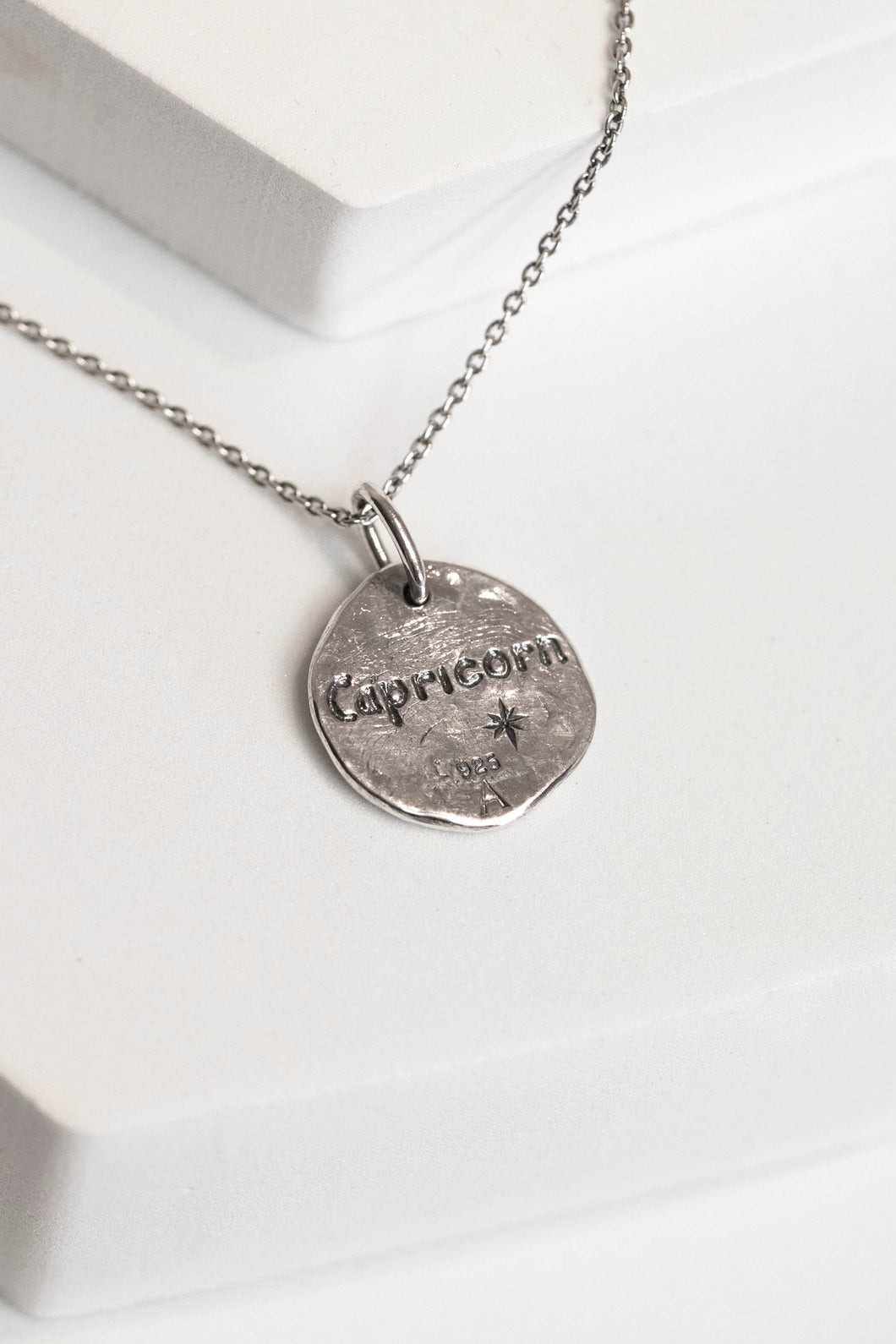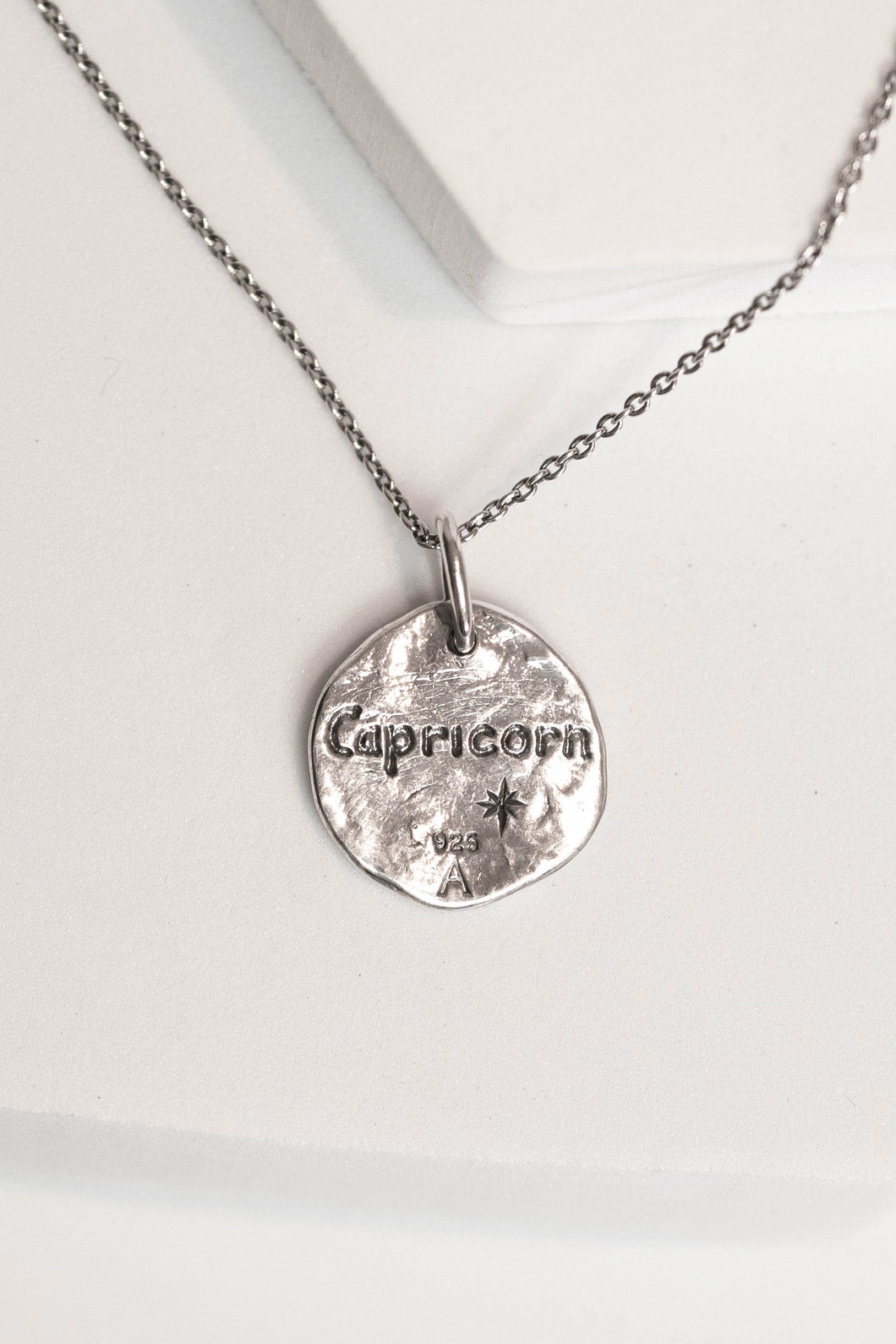 Crafted in .925 sterling silver, the Capricorn glyph rises like a mountain path under watchful stars. The pendant’s hand-hewn texture is reminiscent of a relic.