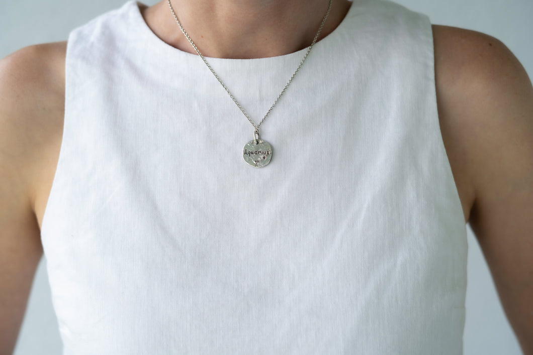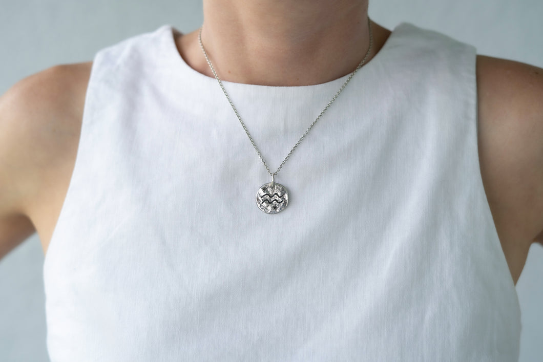 Crafted in .925 sterling silver, the Aquarius glyph flows like waves of air and water, surrounded by stars of cosmic innovation.