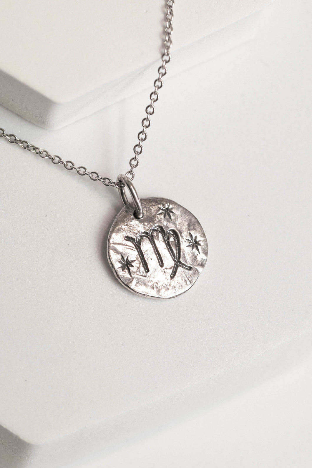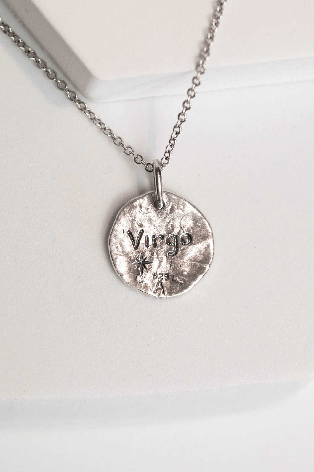 Forged in sterling silver, the Virgo glyph is organically refined, engraved amidst guiding stars.